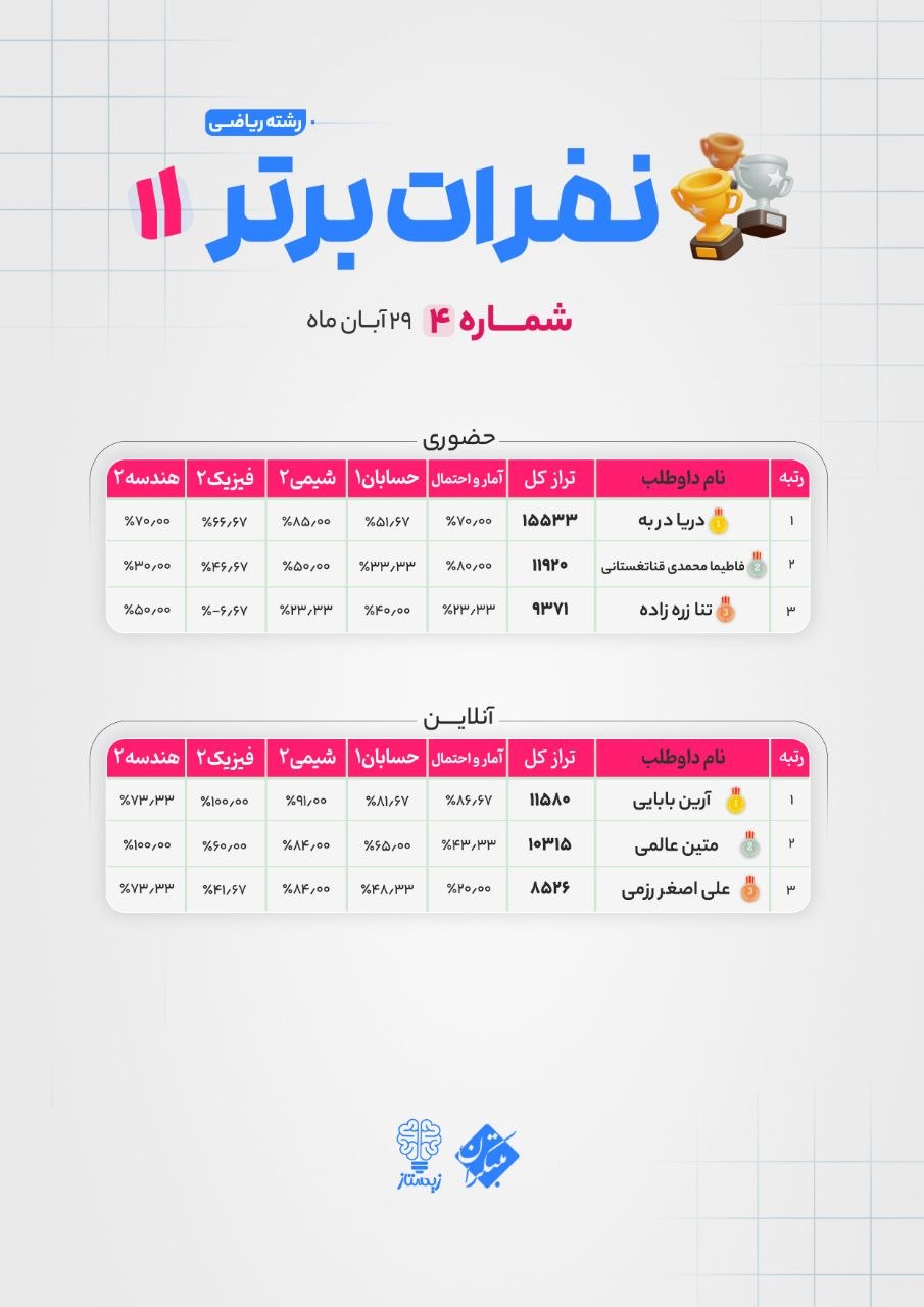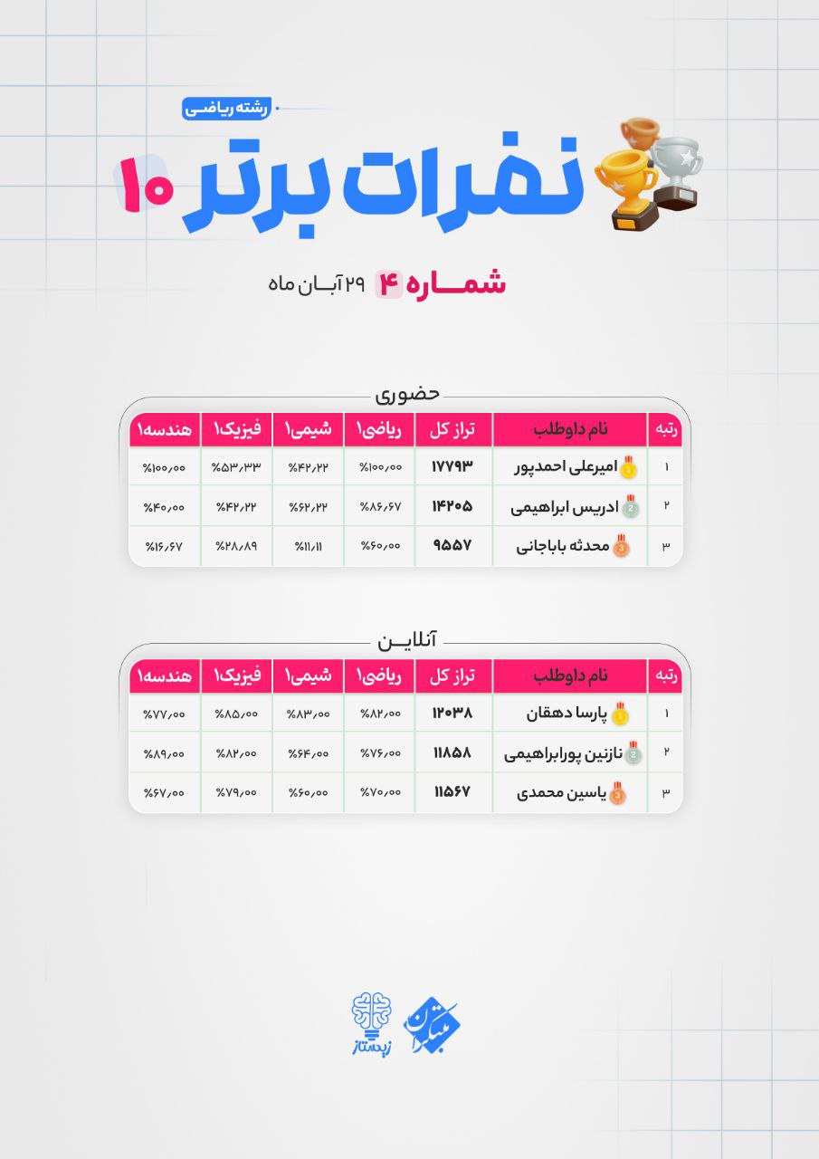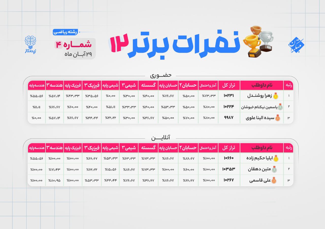 نفرات برتر آزمون شماره 4 (29 آبان)